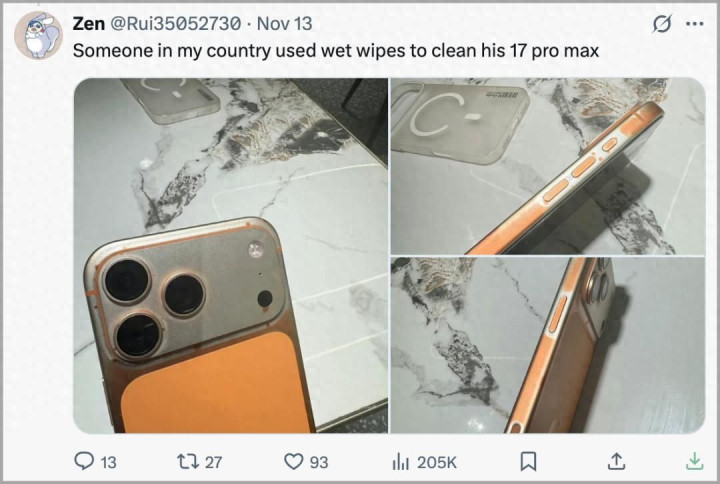 - iPhone17Pro别乱擦! 湿纸巾擦拭后机身漆面严
